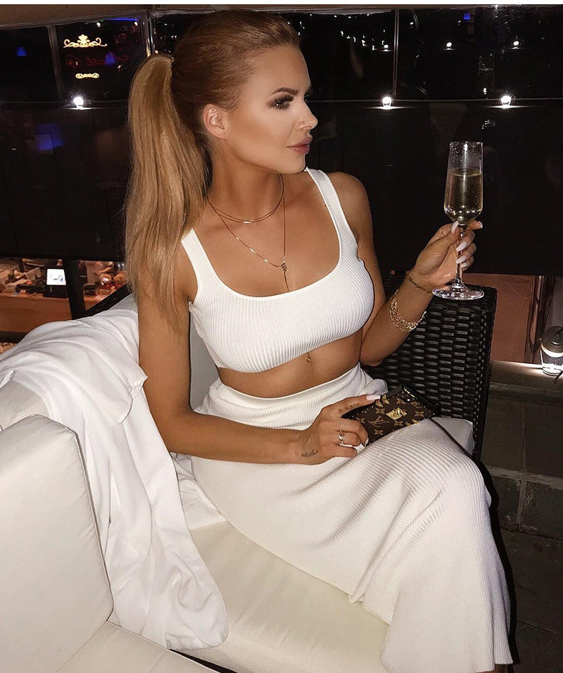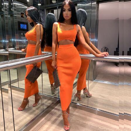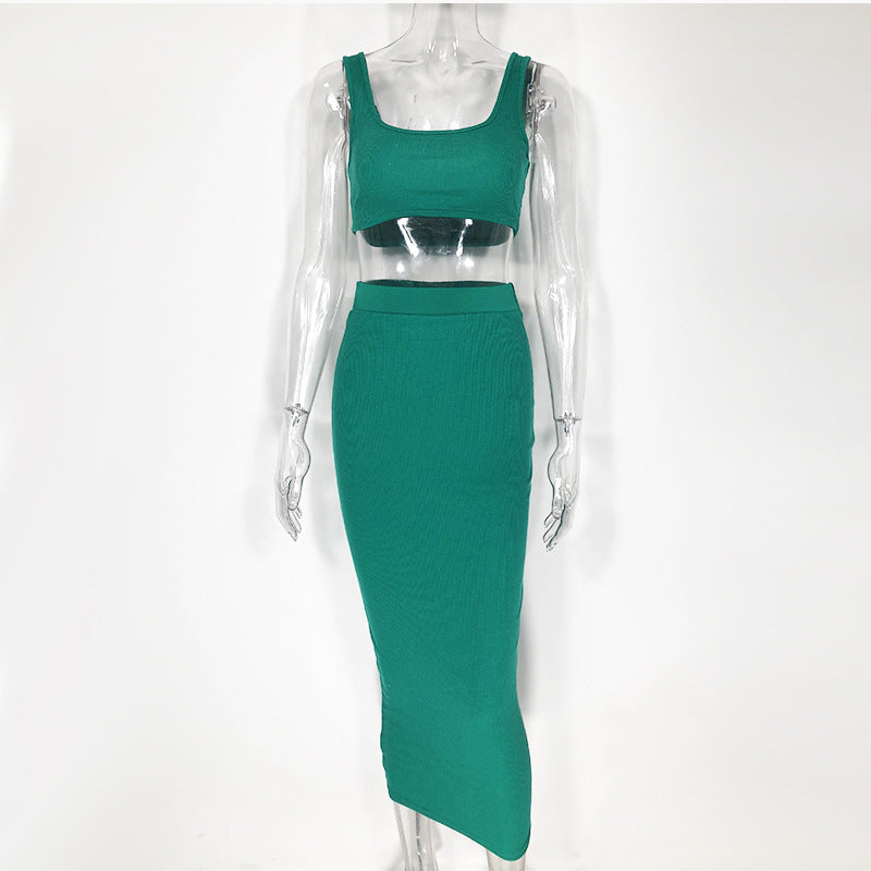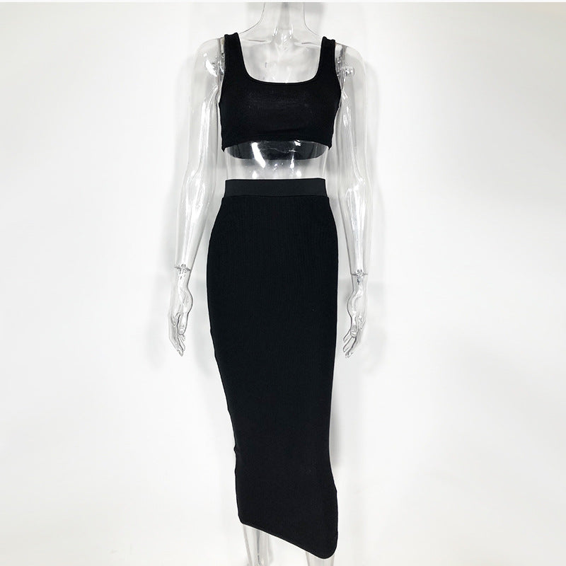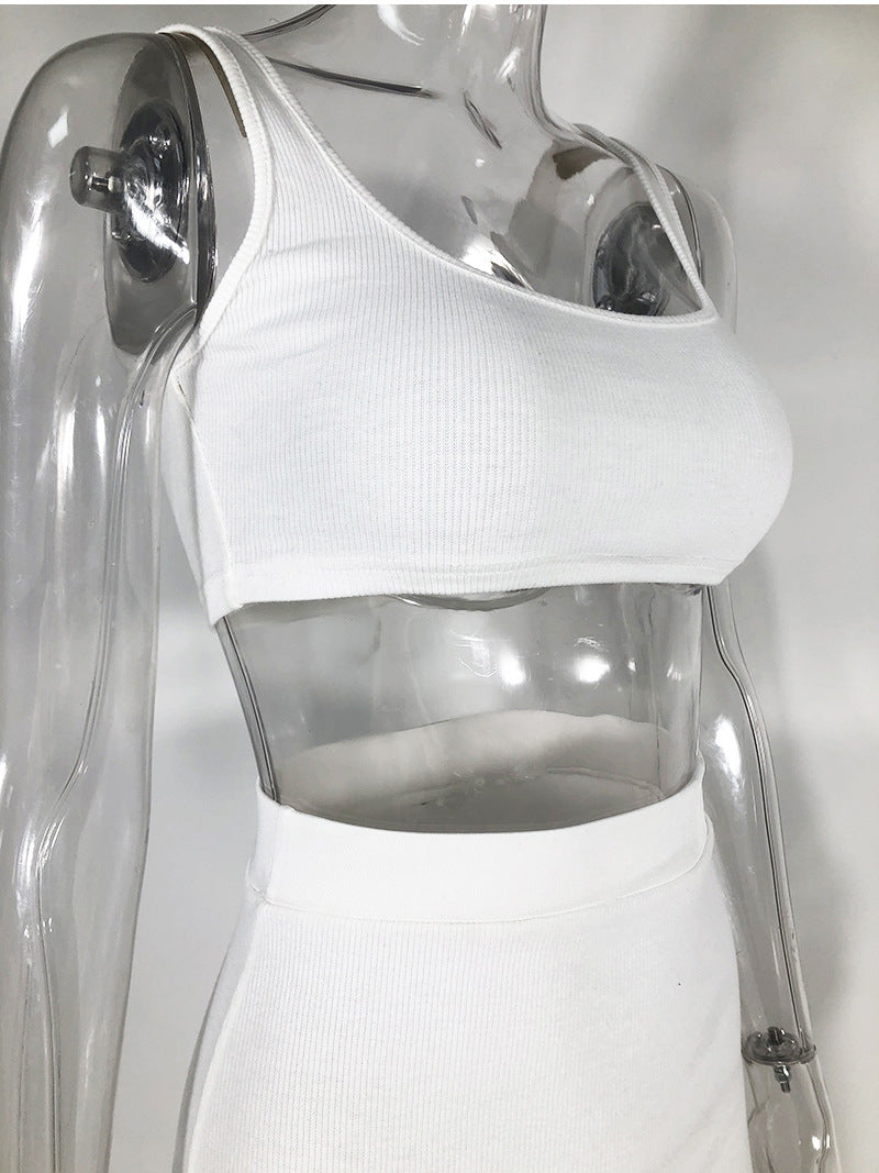 Coordinato crop top e gonna midi a costine che definisce la silhouette con semplicità disarmante. Il top con scollatura asimmetrica lascia intravedere il punto vita mentre la gonna aderente a vita alta scende con proporzioni perfette. Il tessuto a costine in poliestere abbraccia il corpo senza stringere, creando quel profilo pulito e moderno che non passa inosservato.